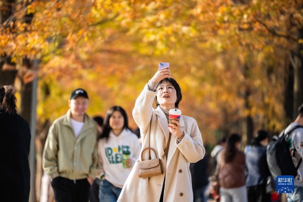 近日,湖南省長沙市烈士公園的水杉樹葉漸露金黃,景色如畫,吸引市民前來游玩打卡。