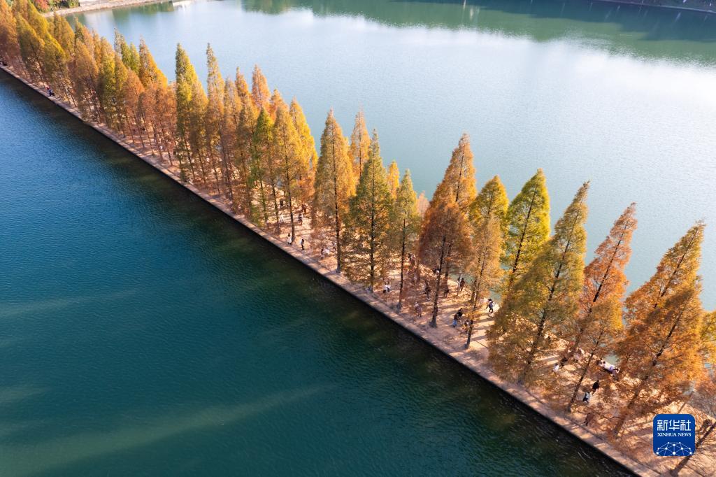 近日,湖南省長沙市烈士公園的水杉樹葉漸露金黃,景色如畫,吸引市民前來游玩打卡。