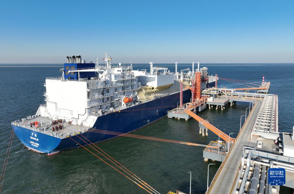 12月1日,“少林”號LNG運輸船靠泊在中國石化天津LNG接收站2號泊位(無人機照片)。