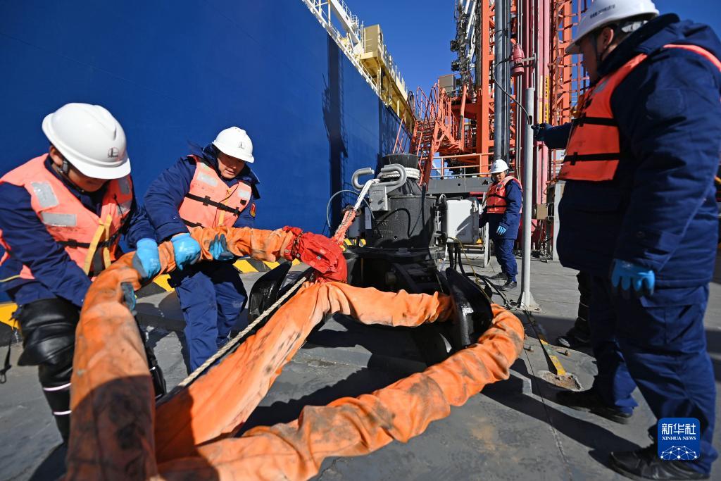 12月1日,工作人員為剛靠泊的“少林”號LNG運輸船固定纜繩。