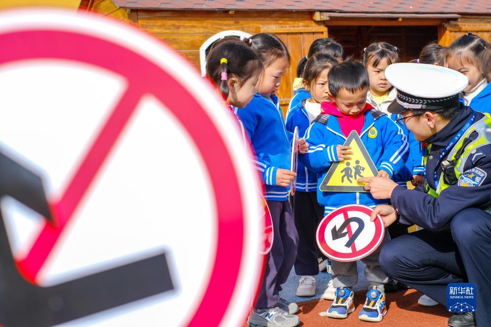 12月1日,在浙江省湖州市長興縣水口鄉中心幼兒園,長興縣公安局水口派出所交警中隊的民警指導小朋友辨識交通標志。