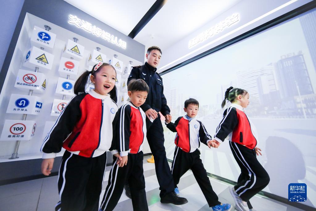 12月1日,在浙江省湖州市長興公安“龍警官”現代警務室內,孩子們在虛擬投影下體驗安全過人行橫道。