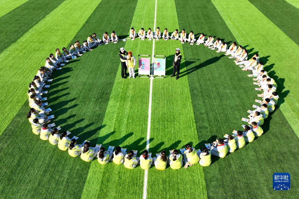 12月1日,在山東省聊城市茌平區第二實驗小學,交警為學生們講解如何安全佩戴頭盔(無人機照片)。