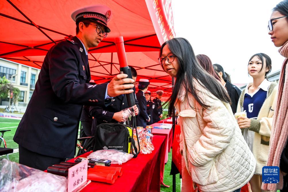 12月1日,在廣西物流職業技術學院,學生們在體驗酒精檢測儀。