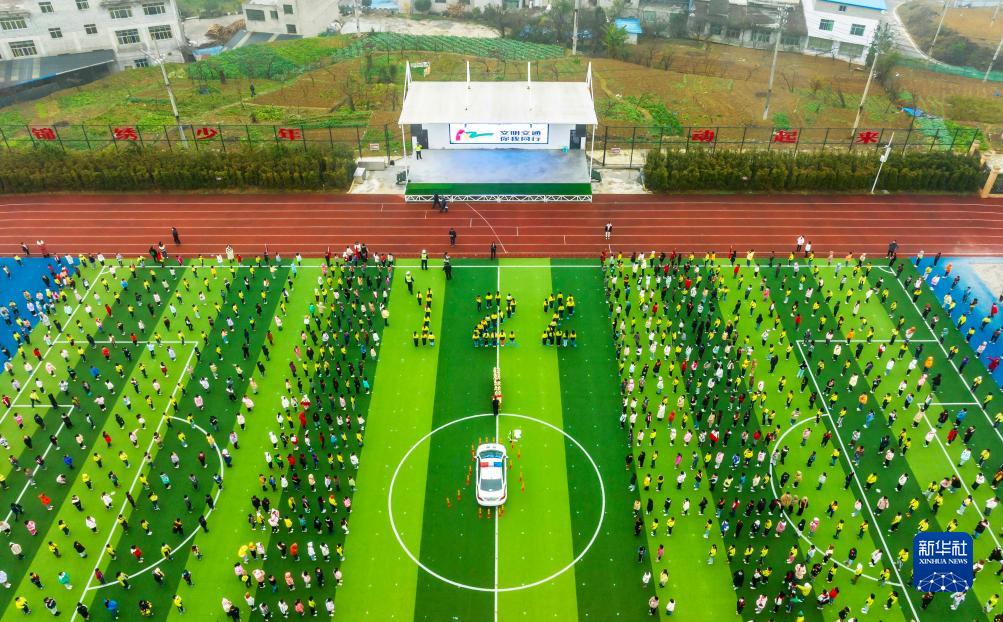 12月1日,交通民警在貴州省黔西市錦繡學校開展交通安全日主題宣傳活動(無人機照片)。