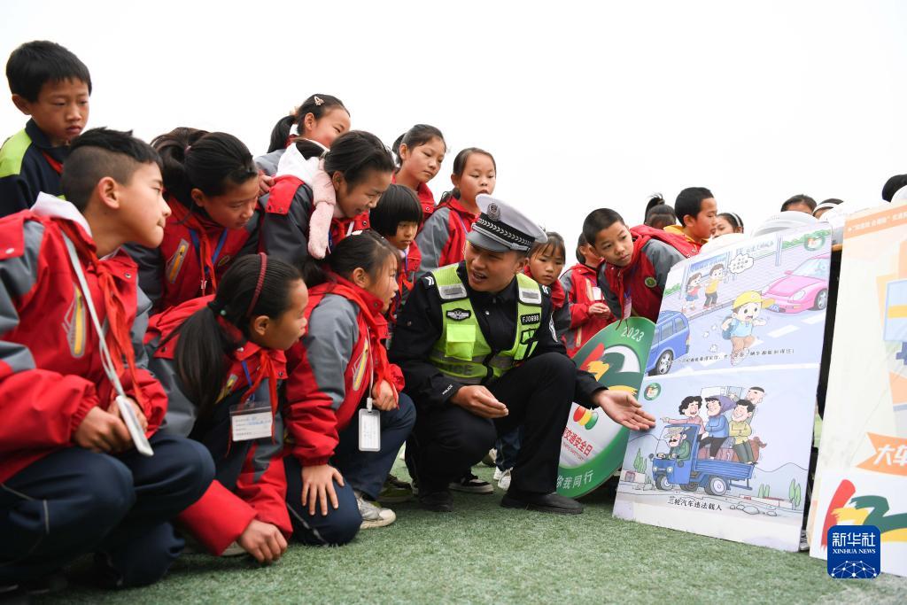 12月1日,在貴州省黔東南苗族侗族自治州黃平縣上塘鎮中心小學,黃平縣公安局交通警察大隊民警給學生們講解交通安全知識。