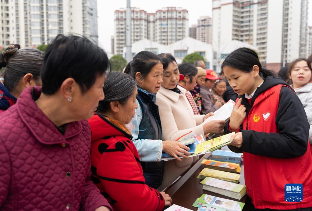 12月1日,志愿者在貴州省銅仁市萬山區丹都街道旺家社區文化廣場為群眾發放防艾宣傳資料。