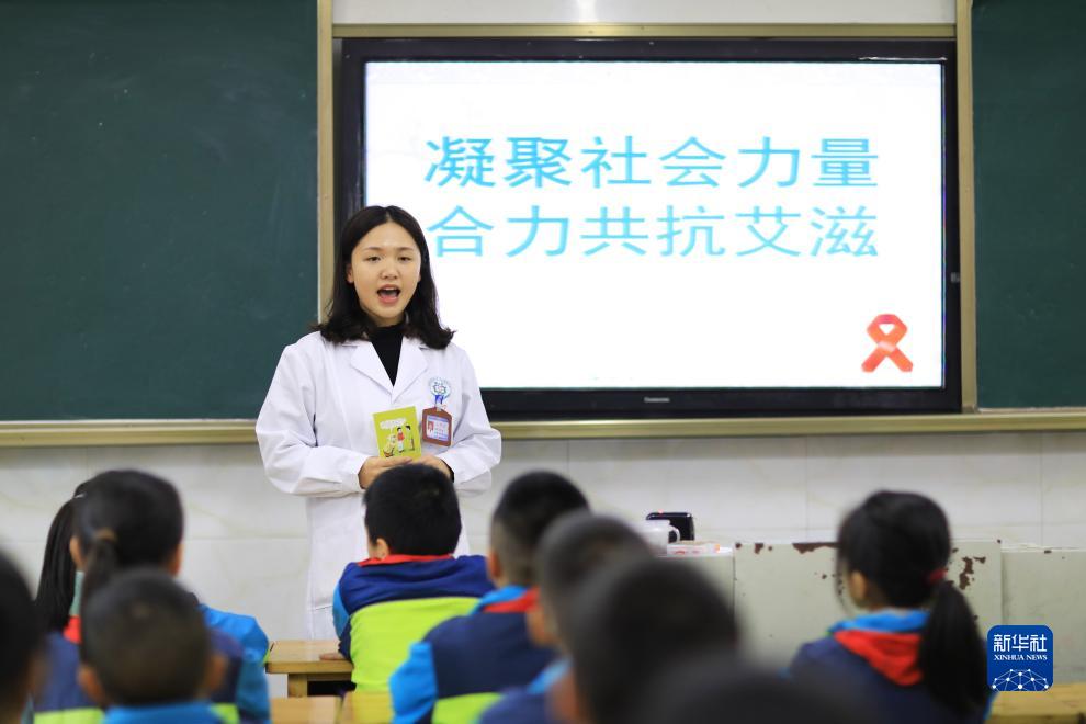 12月1日,貴州省赤水市市中街道社區衛生服務中心醫務人員給學生講解防艾健康知識。