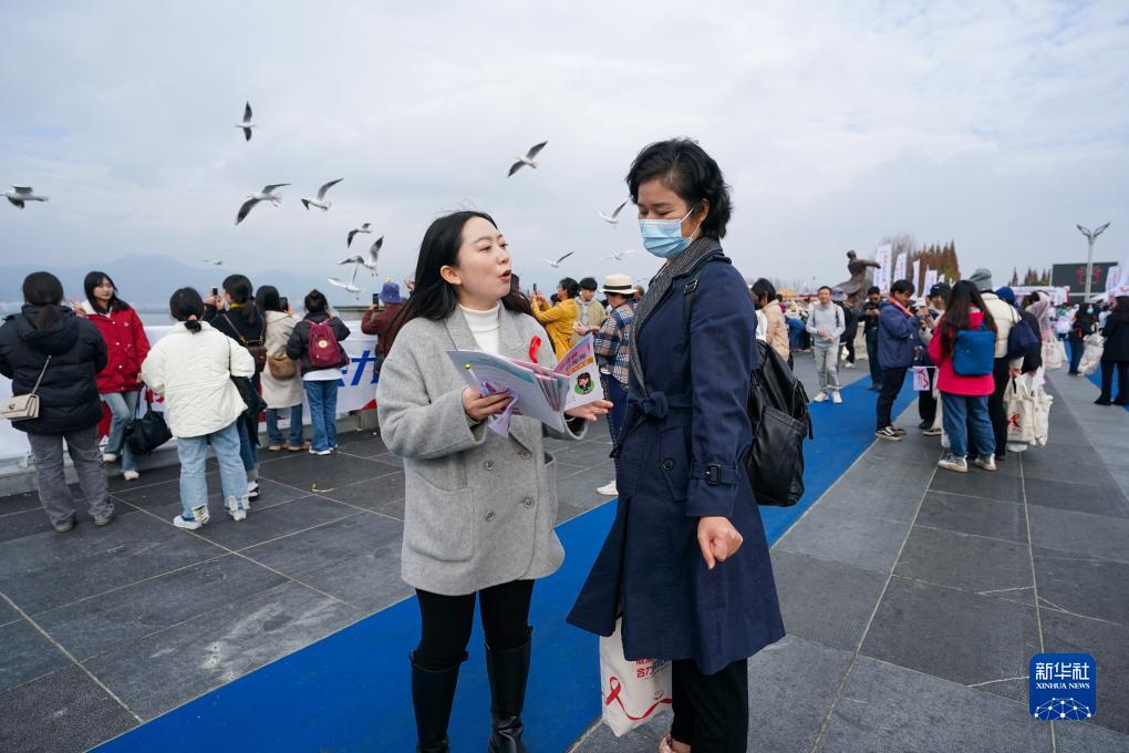 12月1日,一名工作人員(前左)在2023年世界艾滋病日云南省主題宣傳月活動上向市民宣傳艾滋病相關知識。