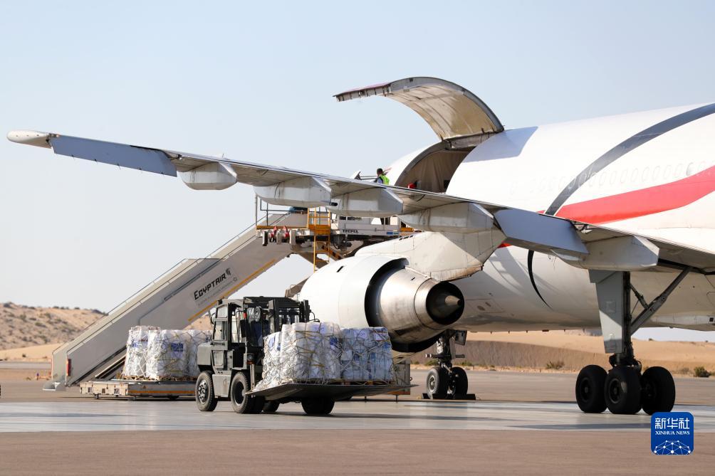 11月30日,在埃及北西奈省阿里什機場,工作人員轉運援助物資。