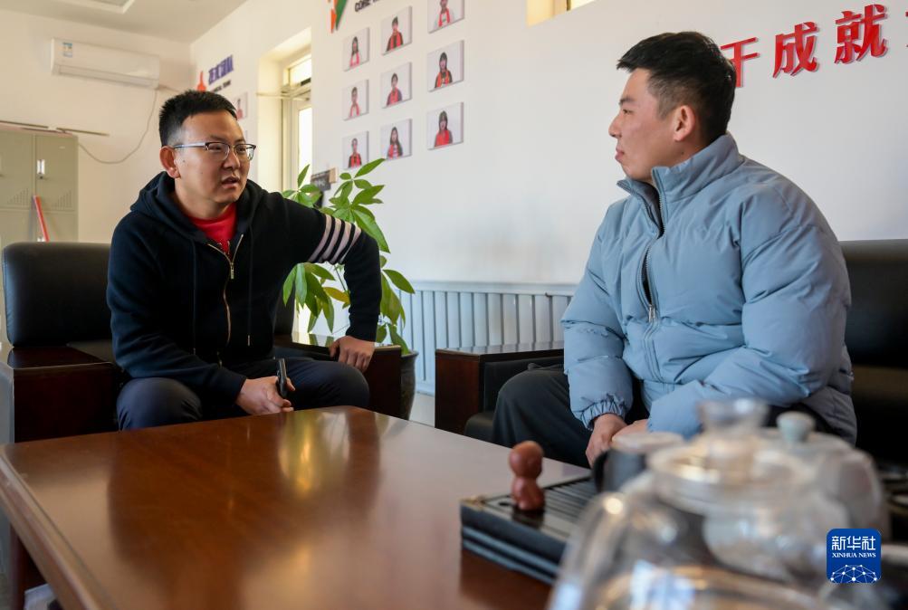 11月30日,高宇(左)在位于曙光村的公司辦公室與客戶交流業務。