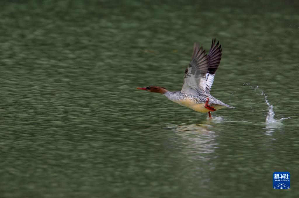 在永泰縣嵩口鎮梧埕村大樟溪,一只中華秋沙鴨振翅飛行(11月29日攝)。