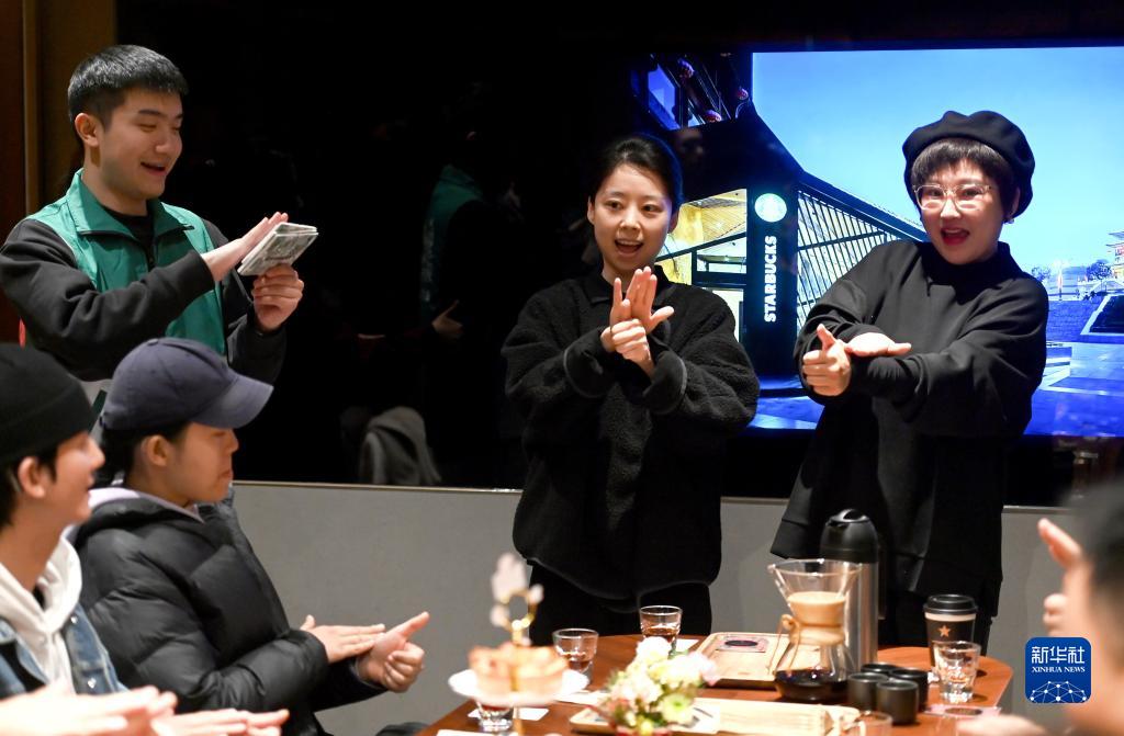 11月30日,李莎(右二)在星巴克手語課堂上教學。