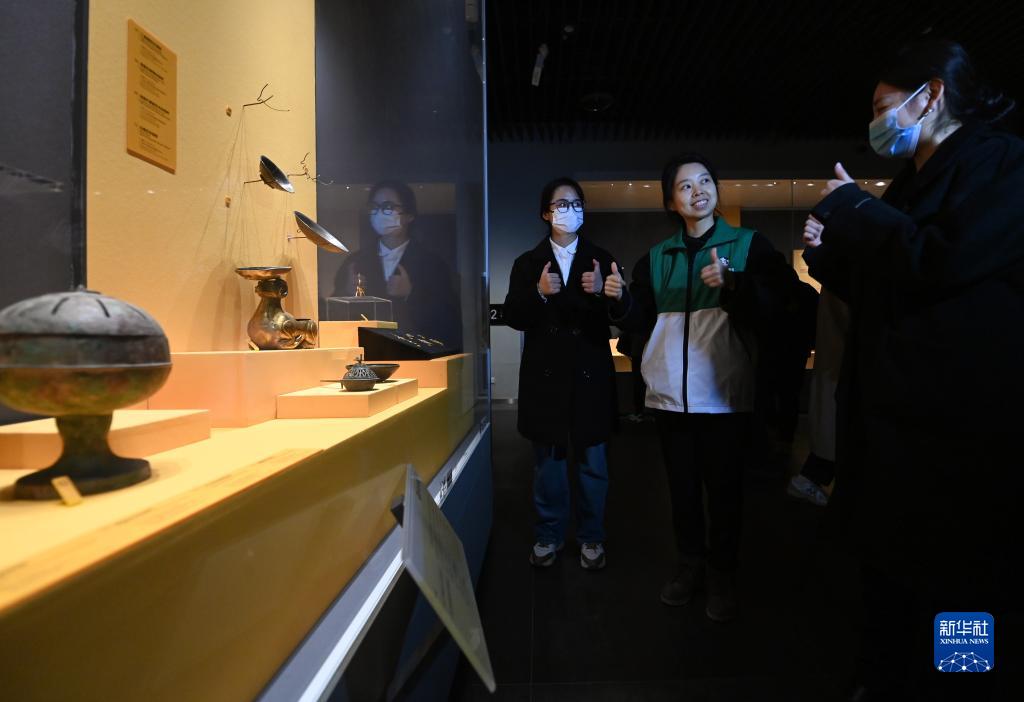 11月30日,李莎(中)和西安博物院講解員用手語交流。