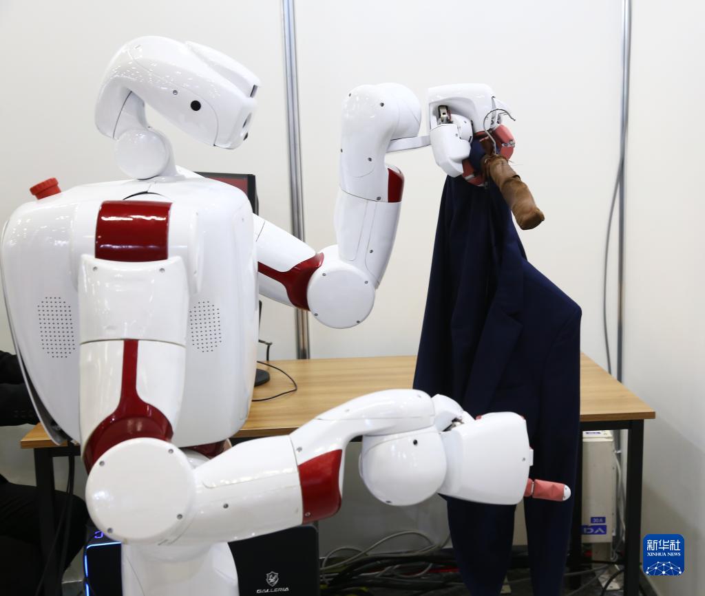 11月30日,在日本東京舉辦的日本國際機器人展上,早稻田大學的機器人展示往衣架上掛衣服。