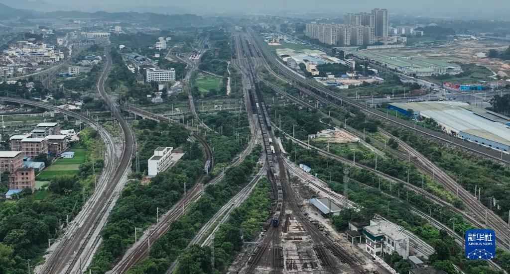 這是進出南寧國際鐵路港的鐵海聯運班列(11月23日攝,無人機照片)。