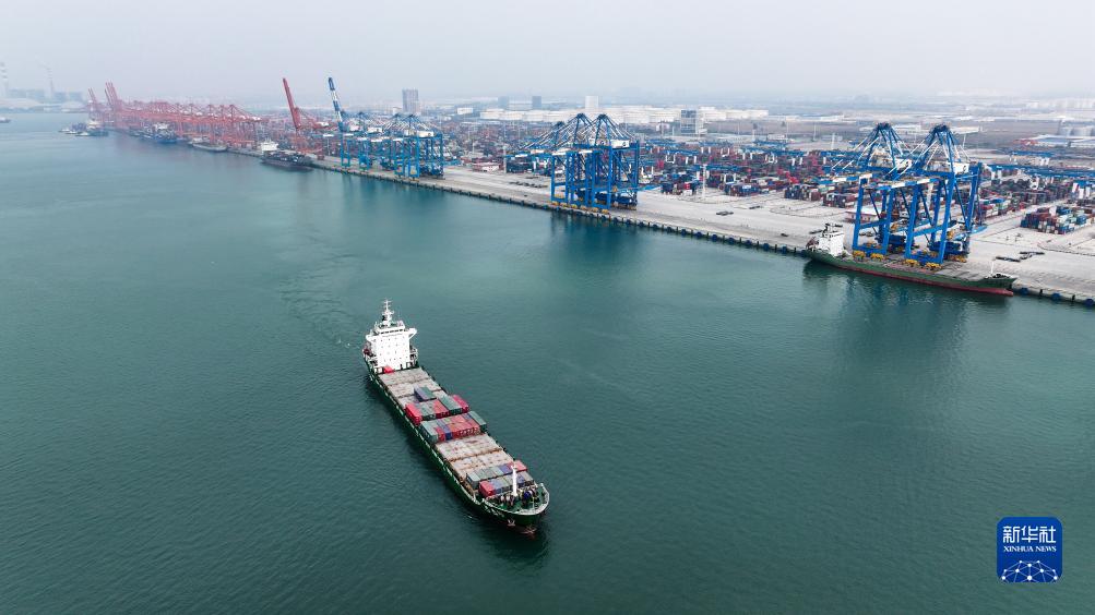 一艘貨輪駛離欽州港集裝箱自動化裝卸碼頭(11月24日攝,無人機照片)。