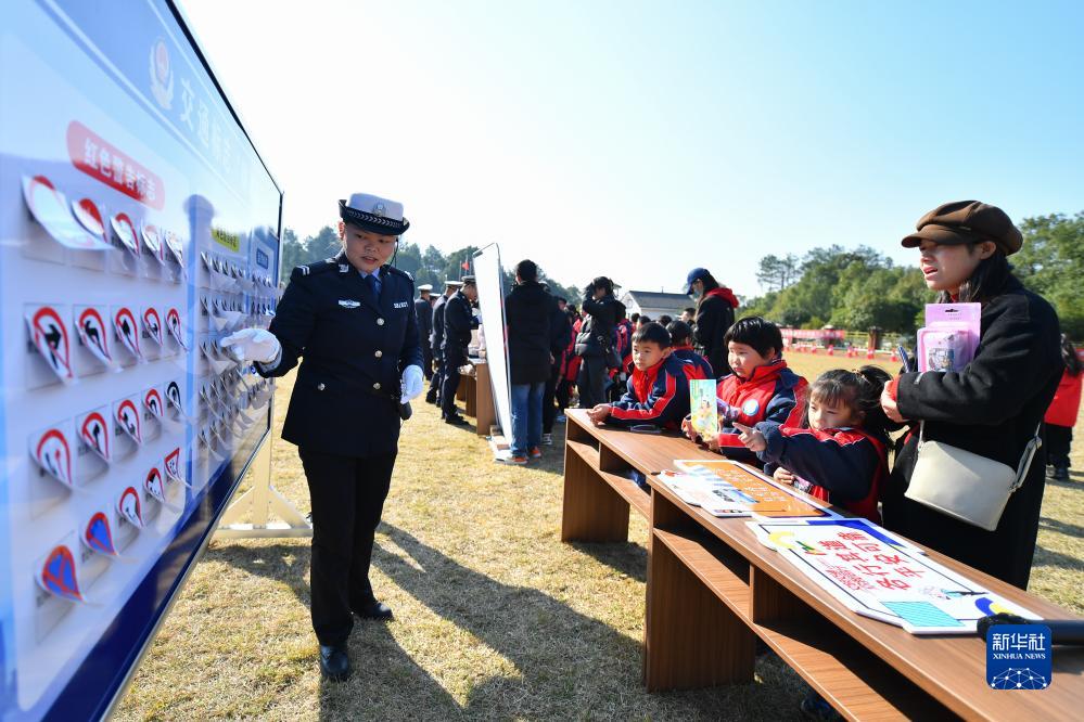 12月1日,在長沙市望城區新河學校,學生和家長參加交通標識競答活動。