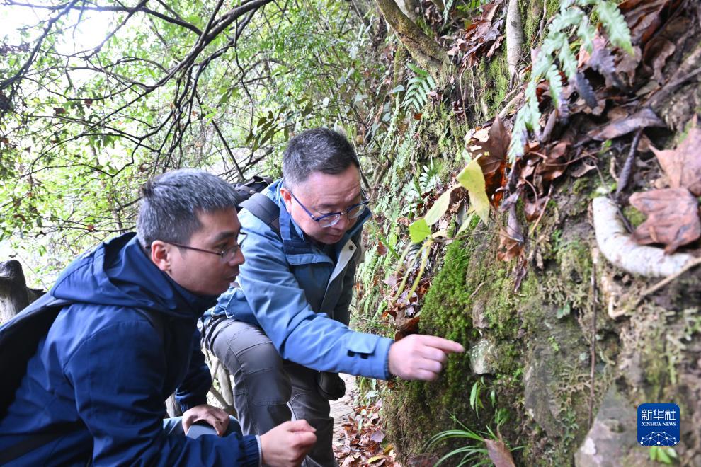 12月1日,福建省農科院食用菌研究所所長增輝(右)與同事在福建閩江源國家級自然保護區考察菌類植物。
