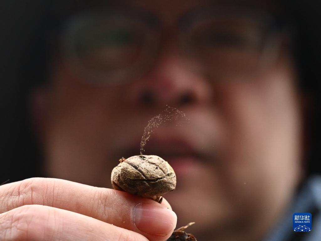 12月1日,福建省農科院食用菌研究所所長增輝在福建閩江源國家級自然保護區演示菌類植物馬勃噴發孢子粉。