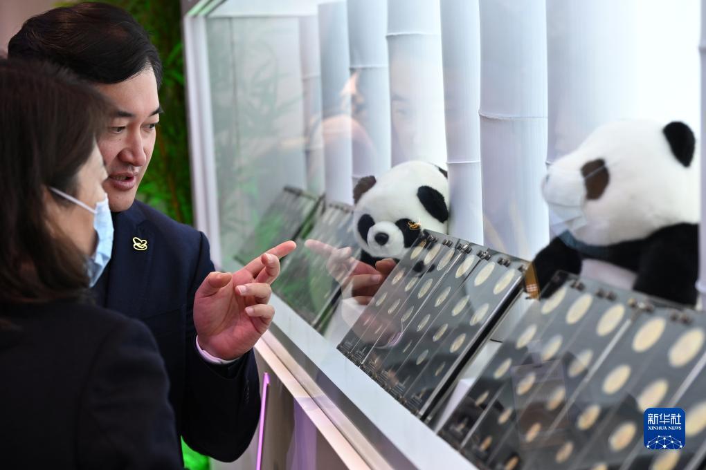 12月1日,參觀者在博覽會上觀看熊貓紀念幣。