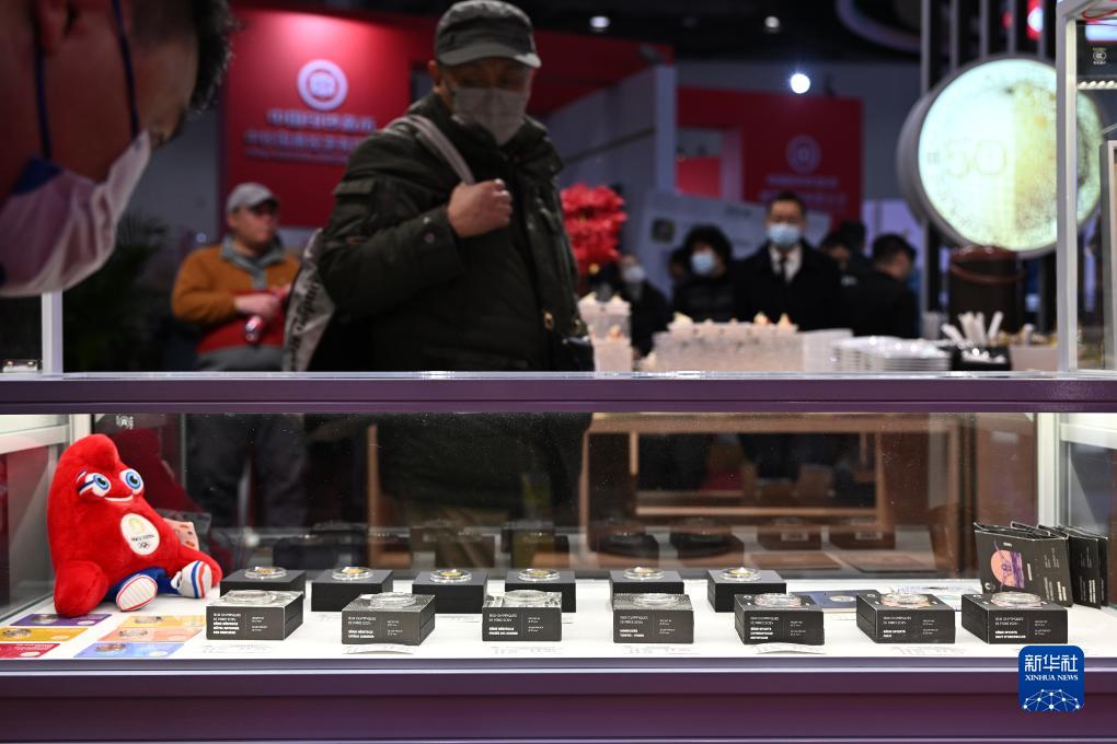 12月1日,參觀者在博覽會上的法國巴黎造幣局展臺上觀看法國巴黎奧運會紀念幣。