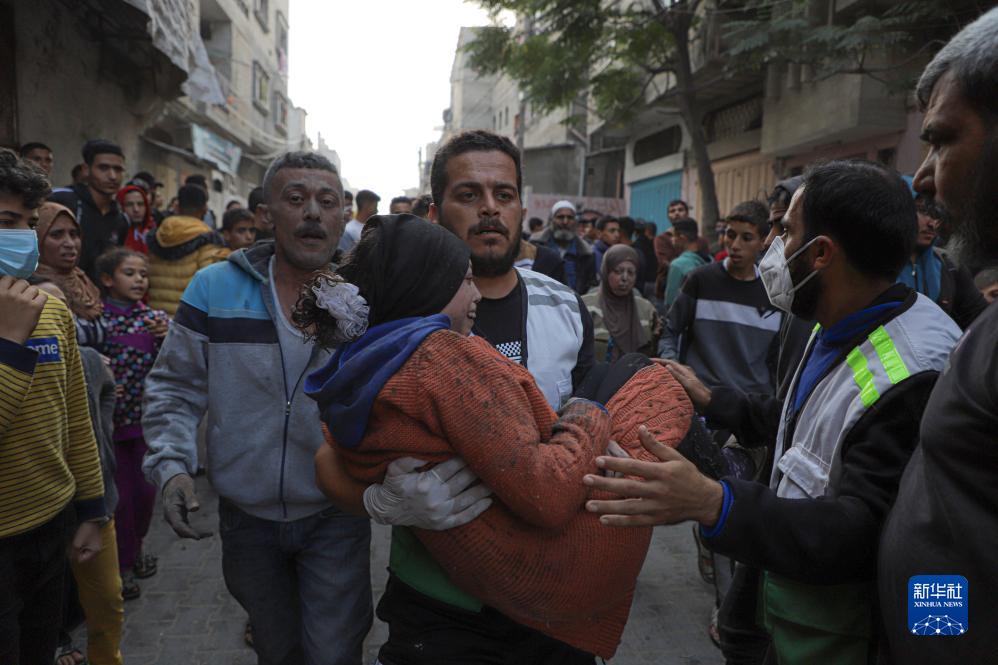 12月1日,在加沙地帶南部城市汗尤尼斯,人們在以軍空襲后開展救援。
