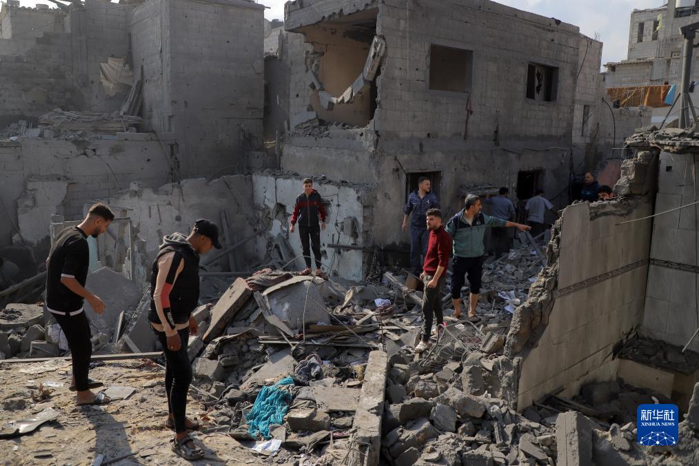12月1日,在加沙地帶南部城市汗尤尼斯,人們查看以軍空襲后的廢墟。