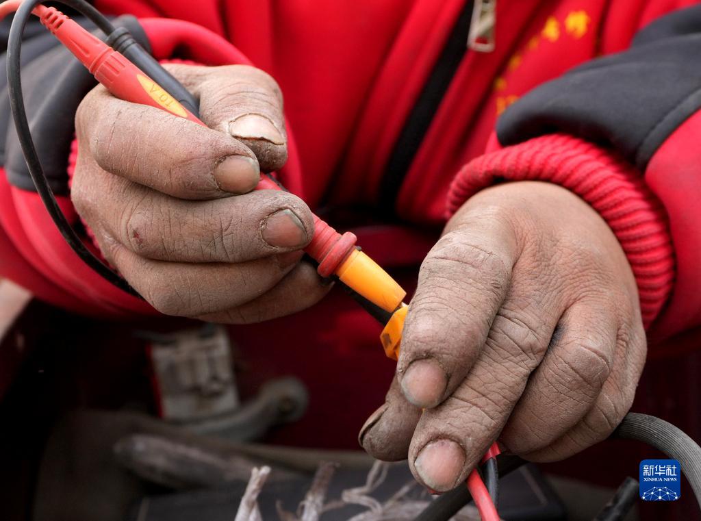 11月15日,在內蒙古自治區烏海市“李宏偉專修電動車”維修店,李宏偉在檢測線路,他的手因為長期工作滿是灰土和裂口。