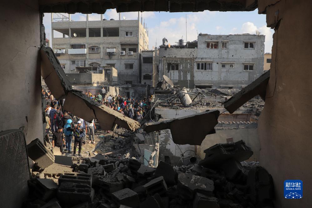 12月1日,在加沙地帶南部城市汗尤尼斯,人們查看以軍空襲后的廢墟。