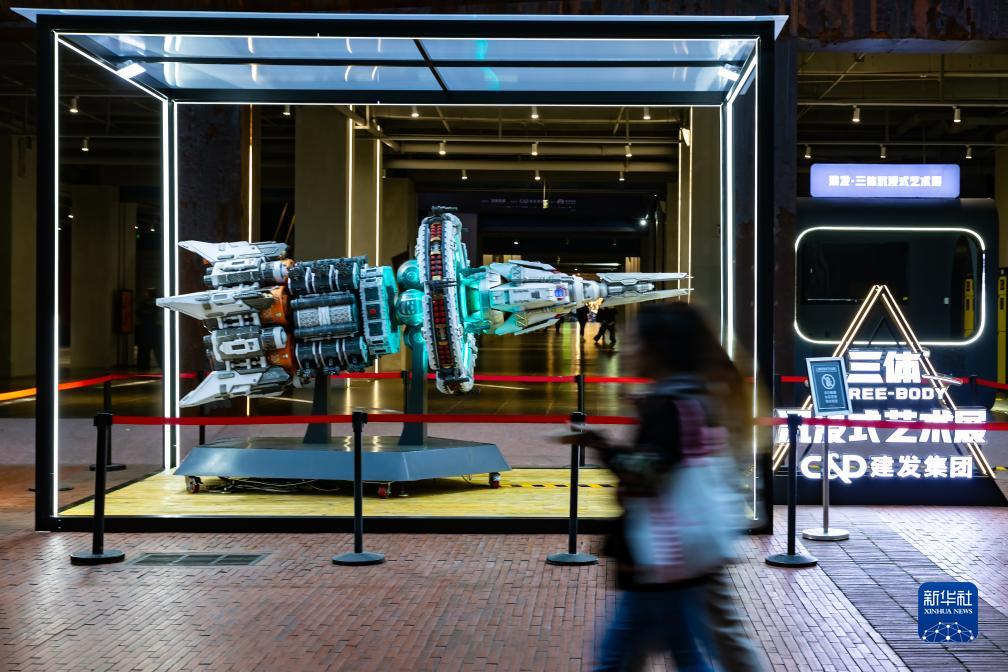 這是12月1日拍攝的“建發·三體沉浸式藝術展”入口處的裝置作品——三體戰艦“自然選擇”號模型。