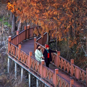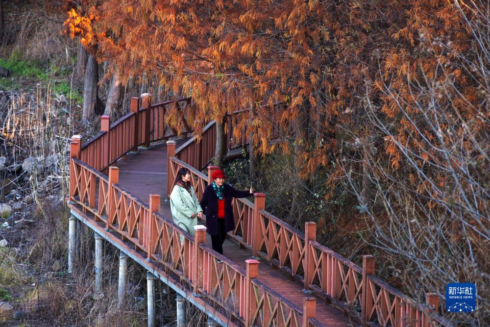 冬日時節,江蘇省盱眙縣天泉湖色彩斑斕,碧水與紅杉相映成趣,構成一幅美麗的冬日生態畫卷,吸引眾多游客前來體驗“人在畫中游”的美感。
