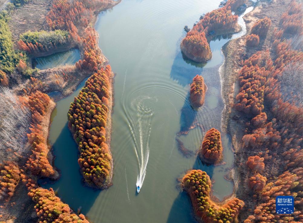 冬日時節,江蘇省盱眙縣天泉湖色彩斑斕,碧水與紅杉相映成趣,構成一幅美麗的冬日生態畫卷,吸引眾多游客前來體驗“人在畫中游”的美感。