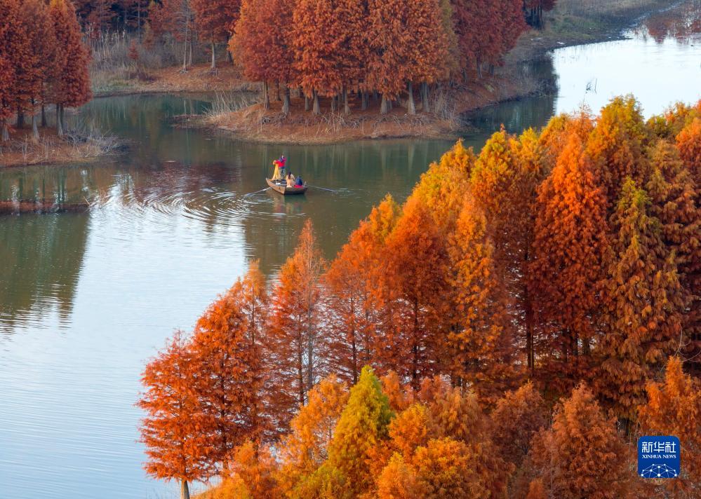 冬日時節,江蘇省盱眙縣天泉湖色彩斑斕,碧水與紅杉相映成趣,構成一幅美麗的冬日生態畫卷,吸引眾多游客前來體驗“人在畫中游”的美感。