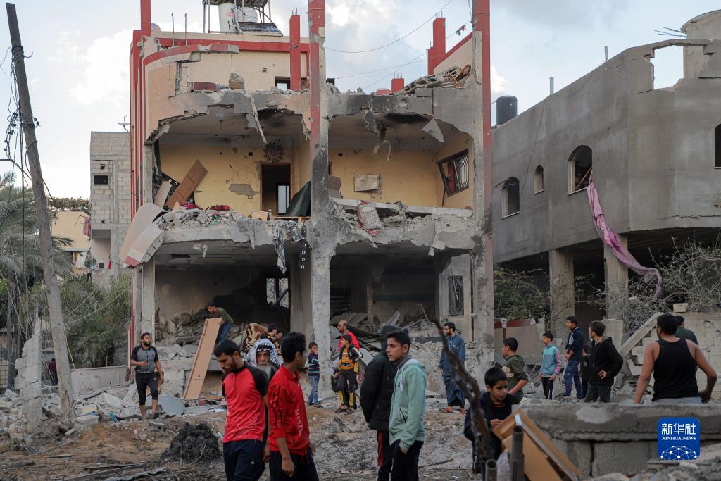 12月1日,人們聚集在加沙地帶南部城市汗尤尼斯一處被炸的建筑前。