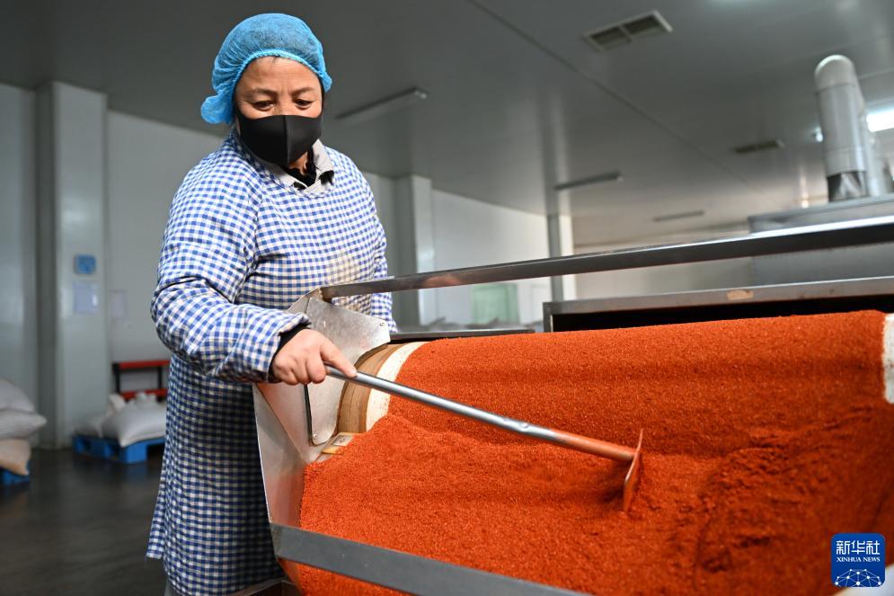 12月1日,河北省望都縣一家辣椒加工企業的工人在辣椒面生產線上工作。