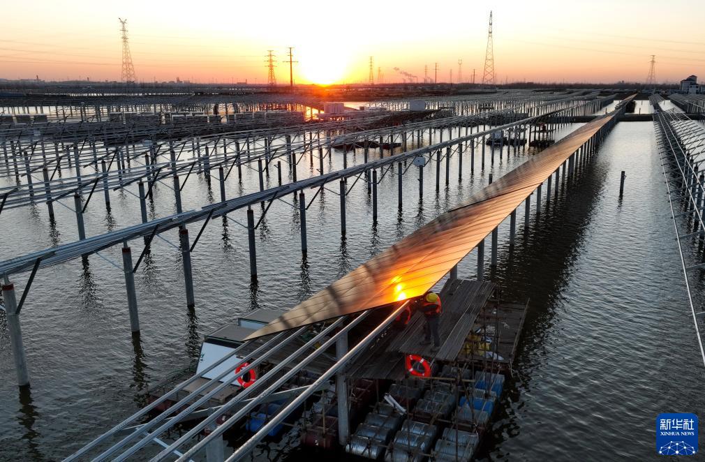 12月1日,工人在河北省唐山市豐南區黑沿子鎮漁光互補項目建設工地施工(無人機照片)。