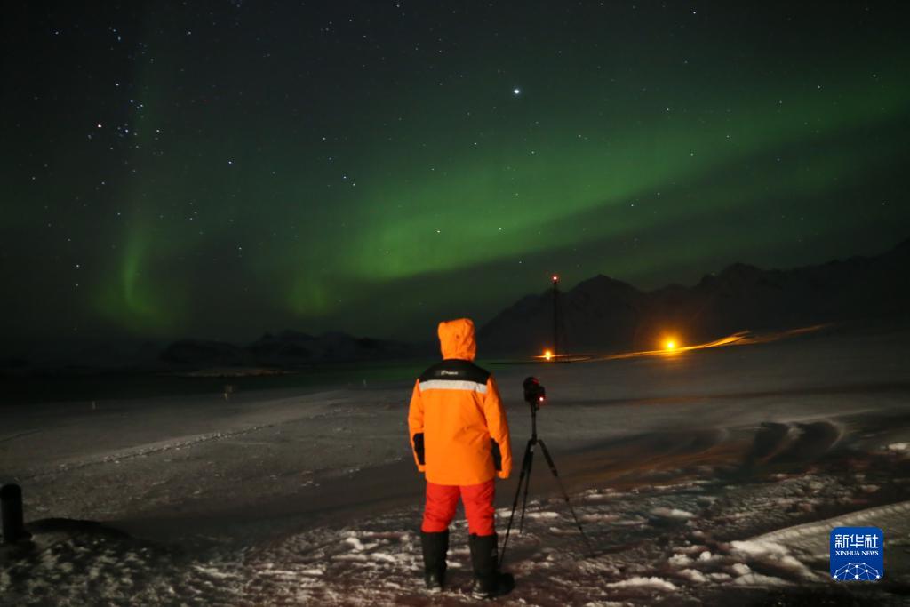 11月10日,中國極地研究中心副研究員李斌在挪威新奧勒松的北極黃河站外拍攝極光。