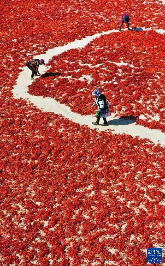 11月28日,村民在貴州省貴定縣寶山街道山桐子加工基地晾曬山桐子(無人機照片)。