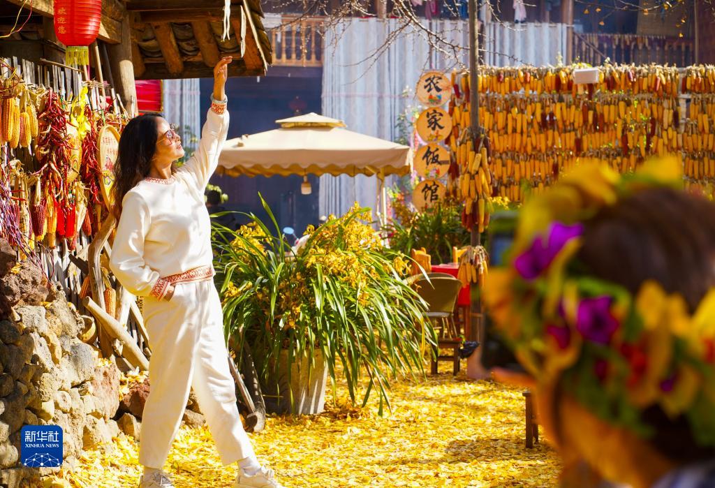 12月2日,游客在云南省騰沖市固東鎮江東社區銀杏村的農家院中游玩。