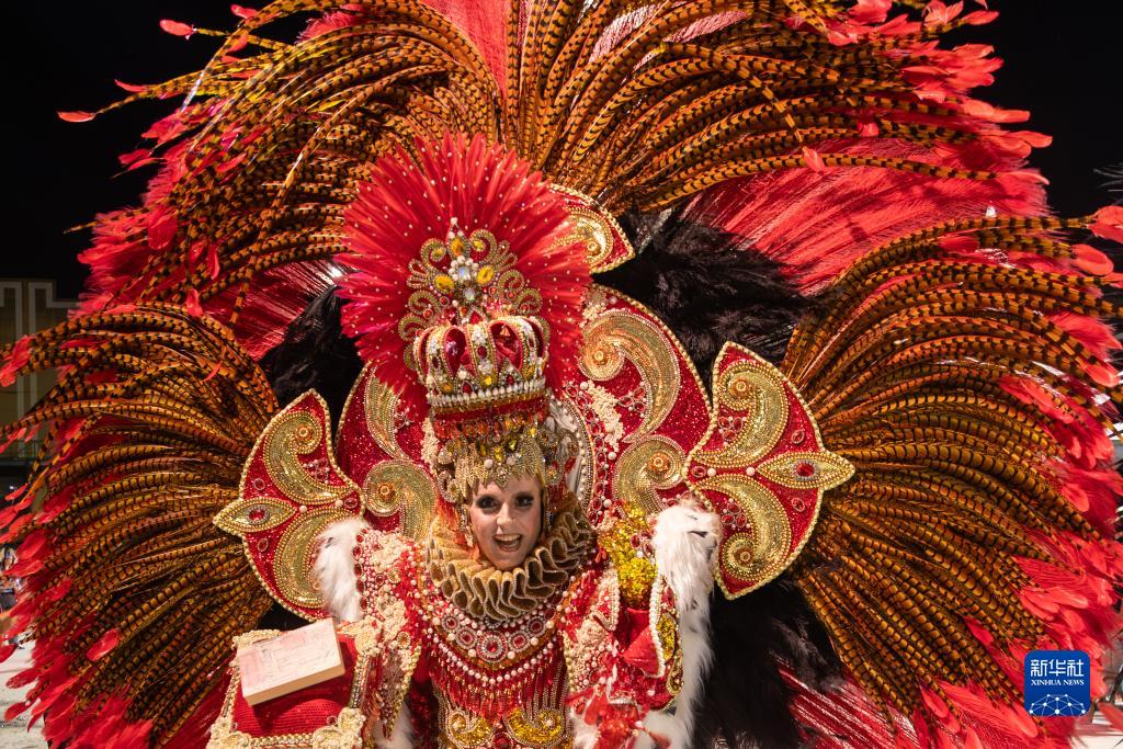 12月2日凌晨,在巴西里約熱內盧桑巴之城,來自薩爾蓋魯舞校的演員參加桑巴游行。
