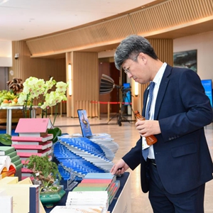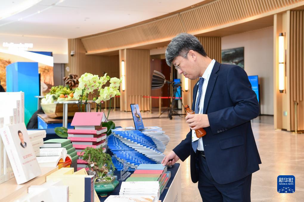 12月2日,一名參會代表在廣州南沙灣濱海會議中心翻閱書籍。