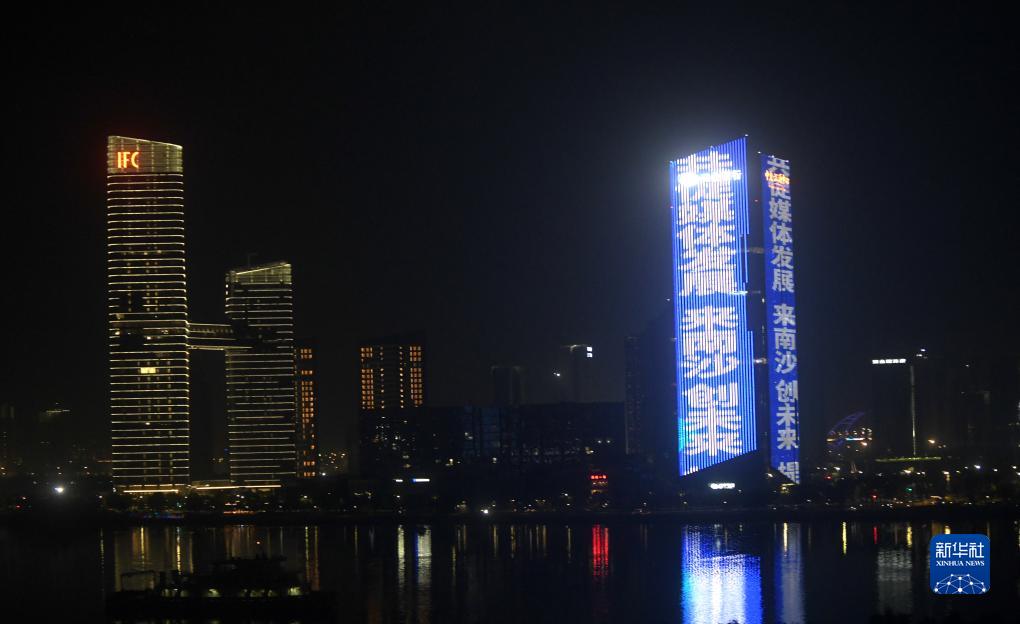 12月2日,廣州南沙地標建筑的電子屏亮燈迎接世界媒體峰會。新華社記者 盧漢欣 攝