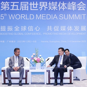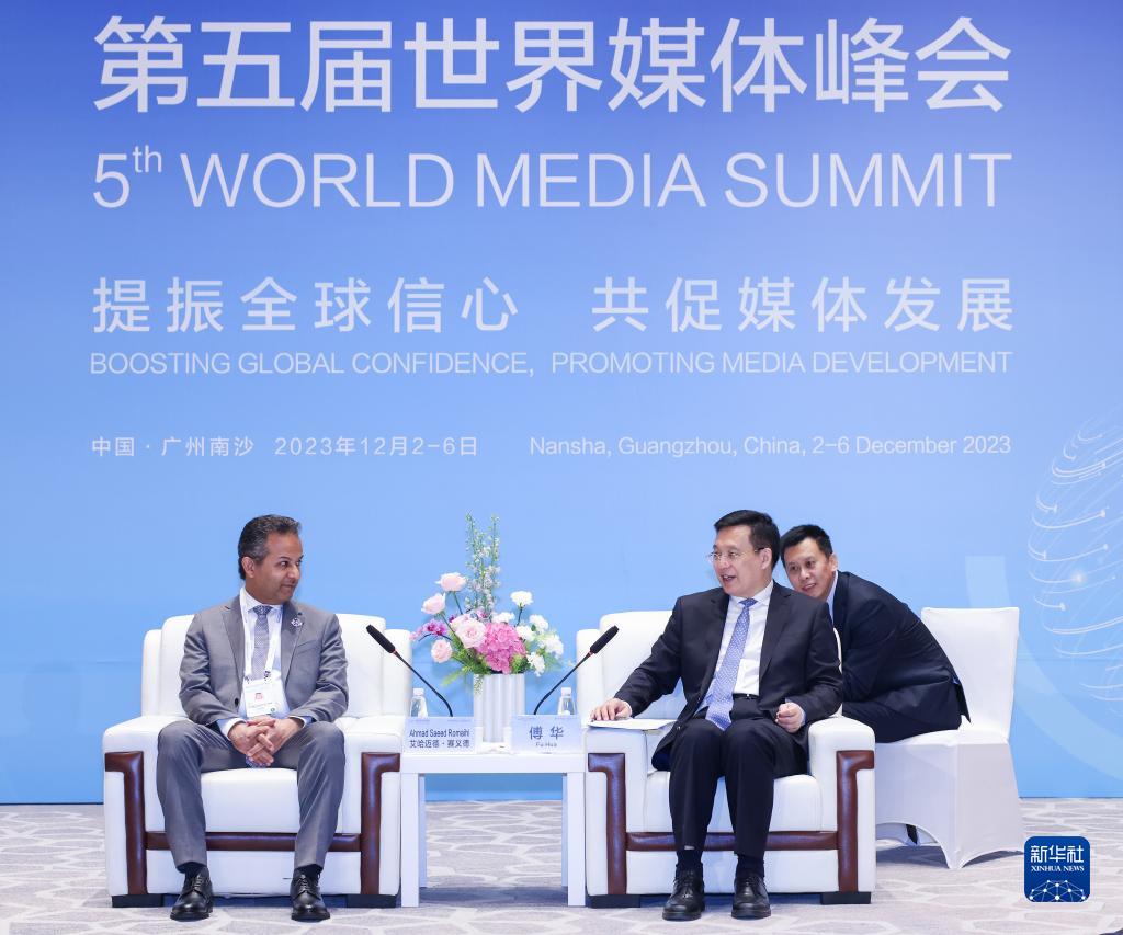 12月2日,世界媒體峰會執行主席、新華通訊社社長傅華在廣州南沙會見來華出席第五屆世界媒體峰會的卡塔爾通訊社社長艾哈邁德·賽義德。新華社記者 劉彬 攝