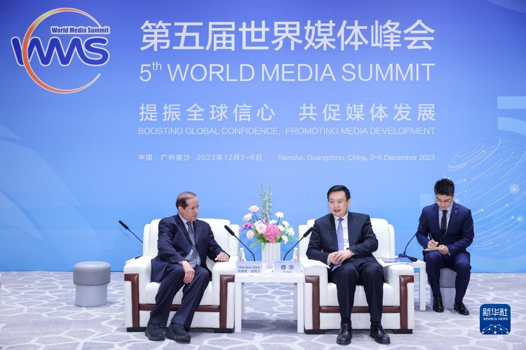 12月2日,世界媒體峰會執行主席、新華通訊社社長傅華在廣州南沙會見來華出席第五屆世界媒體峰會的沙特通訊社社長法赫德·奧格蘭。新華社記者 劉彬 攝