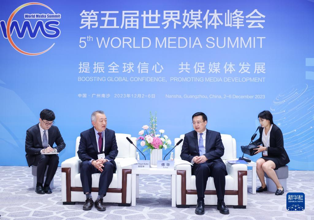 12月2日,世界媒體峰會執行主席、新華通訊社社長傅華在廣州南沙會見來華出席第五屆世界媒體峰會的韓國中央日報社社長高鉉坤。新華社記者 劉彬 攝