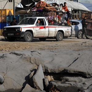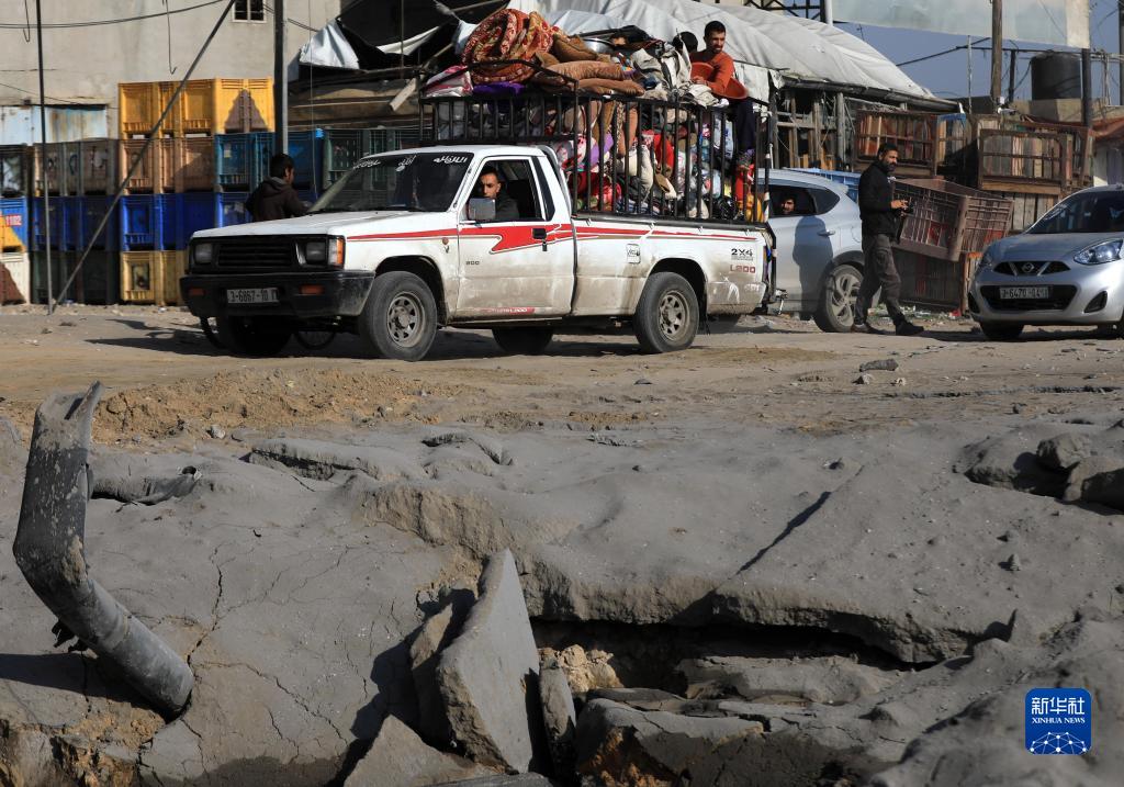 12月2日,在加沙地帶南部城市汗尤尼斯,人們查看以軍空襲后受損路面。