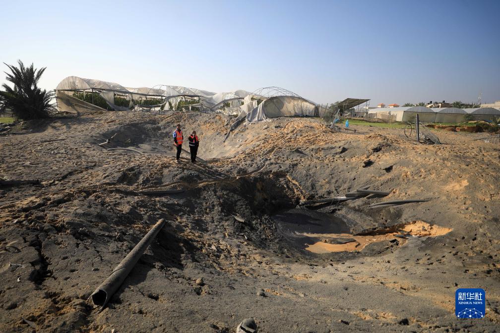 12月2日,在加沙地帶南部城市汗尤尼斯,人們查看以軍空襲后受損路面。