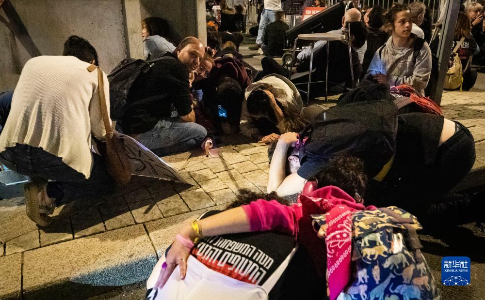 12月2日,在以色列城市特拉維夫,防空警報響起時,身處室外的人們降低身位避難。