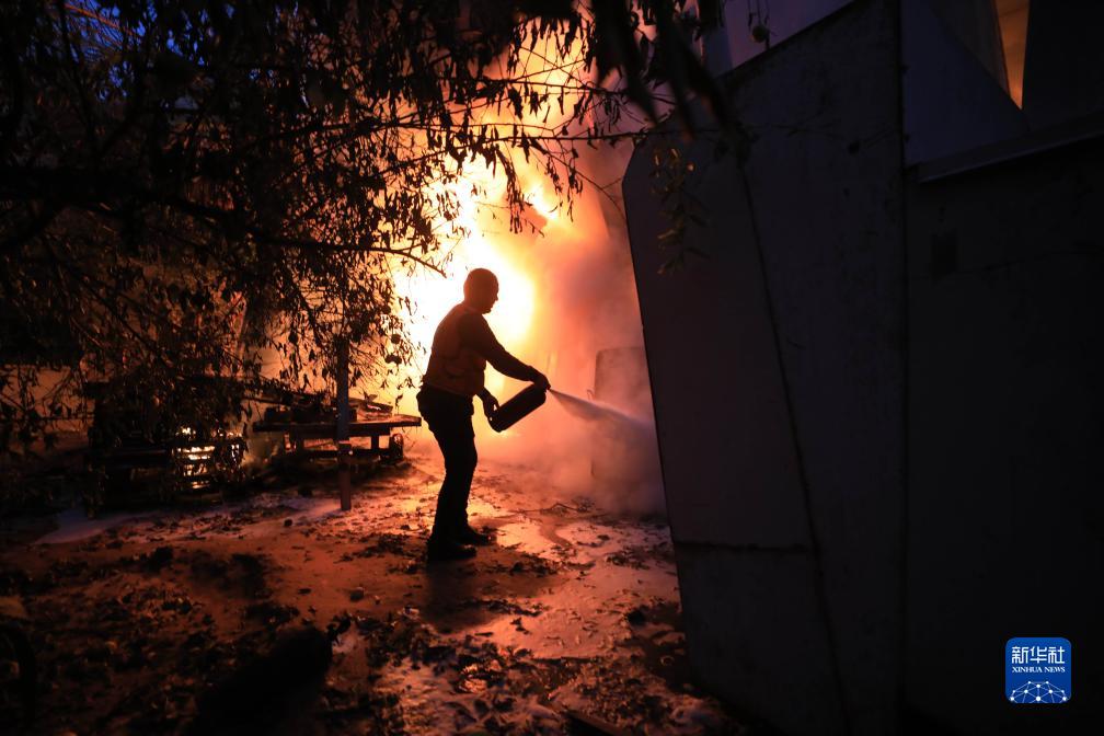 12月2日,在加沙地帶南部城市汗尤尼斯,一家塑料廠遭遇以軍轟炸后起火。